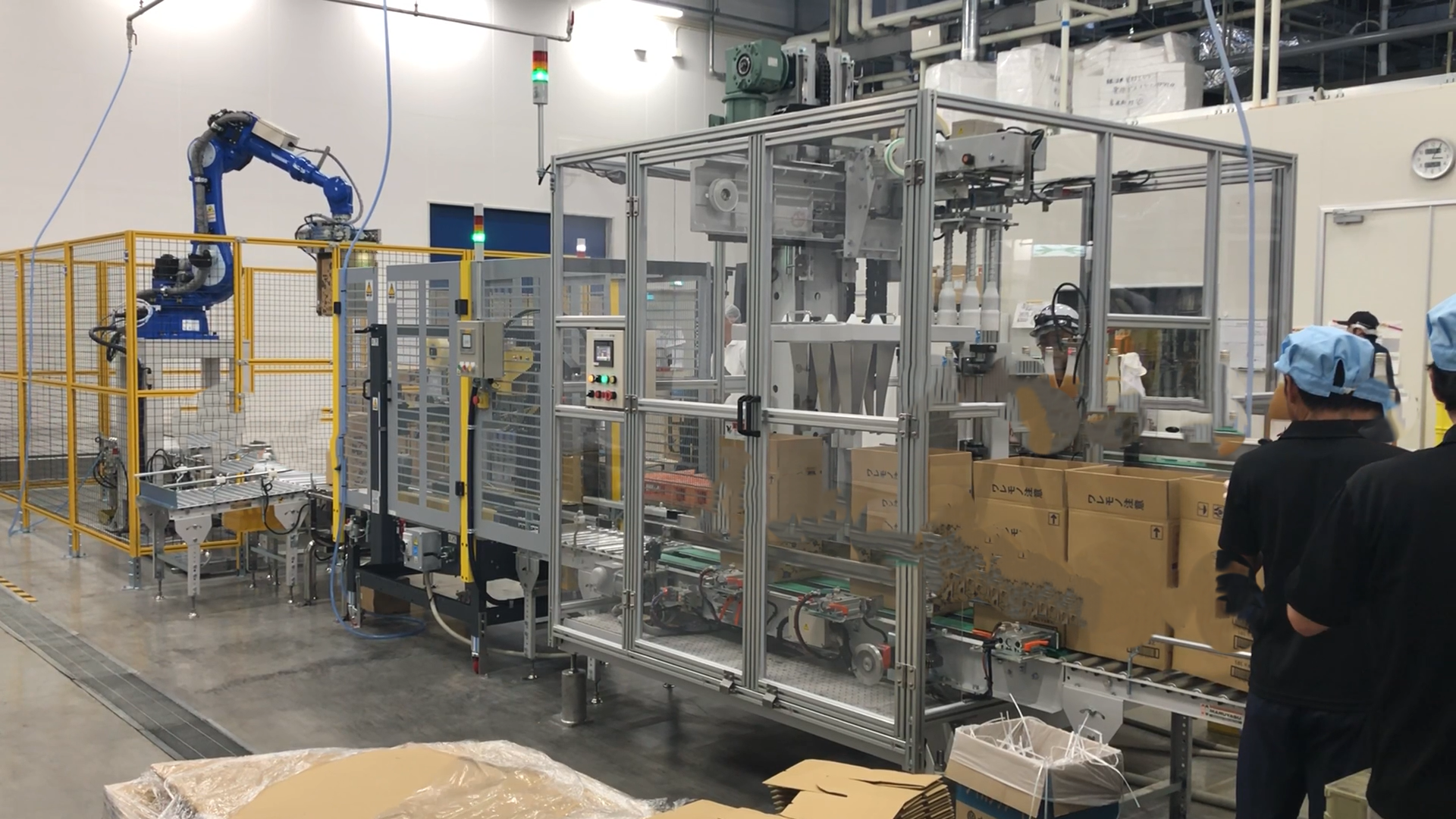 ロボットパレタイザーのシステムを導入し、効率化や省人化を達成できました。新規のライン構成である製函機、ケーサー、封函機、ウェイトチェッカー、不良品排斥装置、及びロボットパレタイザーのシステムを導入することが出来ました。既設ラインの機械と電装との接続も問題なく稼働することが出来ました。新規の機械導入後は人手作業としてケースの投入と、空パレットと実パレットの荷捌きだけとなり、効率化や省人化の当初の目的を達成することが出来ました。